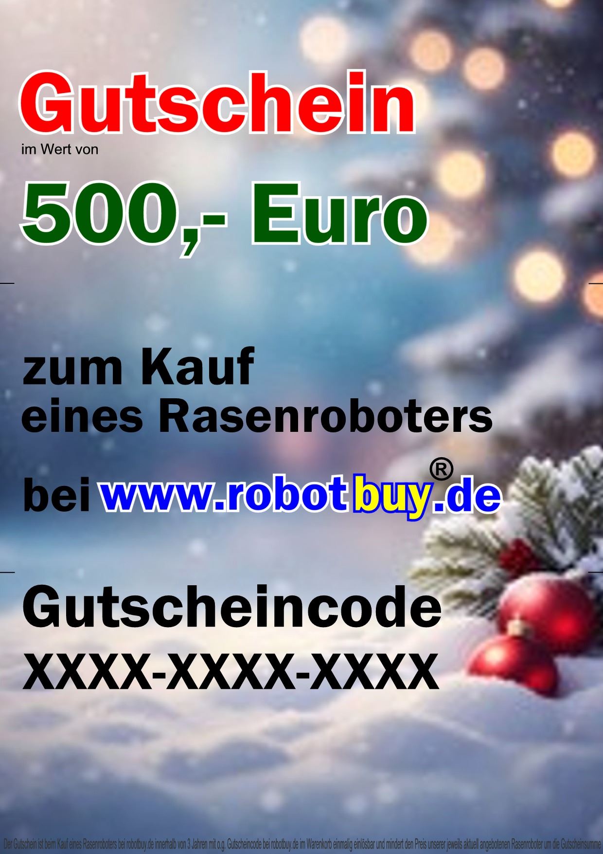 Gutschein im Wert von 500,- Euro mit dem dargestellten Motiv. Der Gutschein enthält im Original einen 1xeinsetzbaren Gutscheincode und kann bei Kauf eines Rasenroboters bei uns im Warenkorb eingelöst werden. Der Gutschein wird Ihnen im pdf Format (randlos-wie Dargestellt) per E-Mail zugestellt. ... eventuelle Ränder bei Ihrem Ausdruck ergeben sich dann von Ihrem eigenen Drucker...
